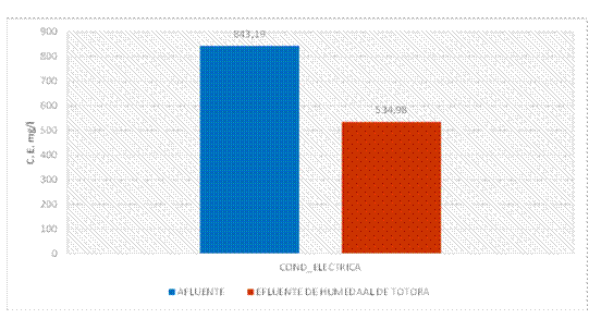 Gráfico 3. Comparación de la conductividad eléctrica disuelto del afluente y efluente del humedal de totora.