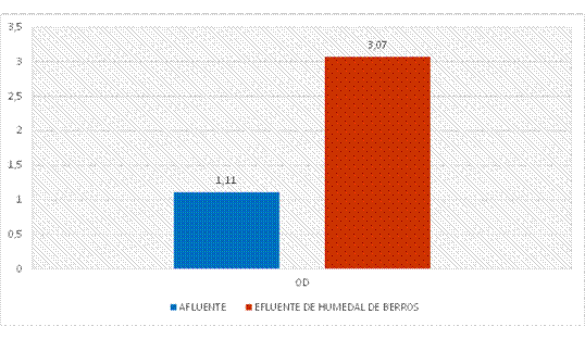 En relación a la demanda química de oxígeno (DQO) (Gráfico 6), se puede observar la eficiencia 559.45 para el afluente y 118 del efluente, se puede decir estadísticamente que existe una eficiencia del humedal de berros, por tanto, que el sistema degrada la materia orgánica.