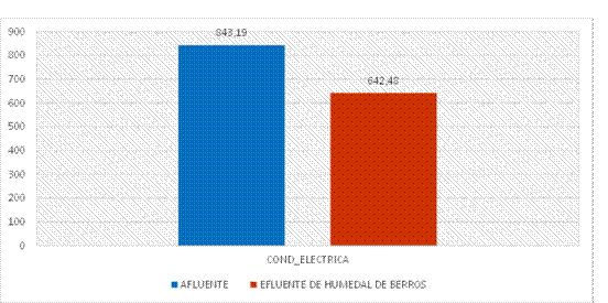 Gráfico 8. Comparación de la conductividad eléctrica del afluente y efluente del humedal de berros.