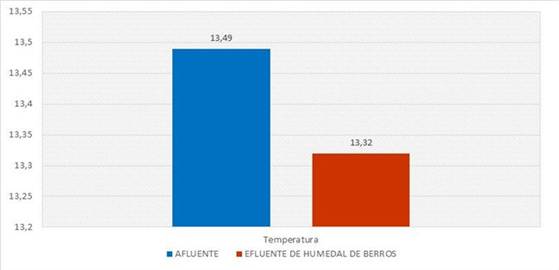 Según los resultados obtenidos para la temperatura (Gráfico 9), en el sistema de humedal artificiales de berro, han logrado una temperatura del afluente de 13.49°C, y en efluente 13.32°C, se puede evidenciar que disminuye en un porcentaje mínimo mejorando el tratamiento de aguas residuales porcícolas.