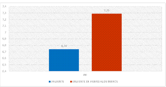 En relación al potencial de hidrogeno (pH) (Gráfico 5), se observó que hay un aumento, de 6.74 en el afluente considerado un medio acido, a 7.36 en el efluente, que es un medio neutro, siendo este valor de pH adecuado para cualquier tipo de tratamiento de agua residual y es un indicador que hay una eficiencia del sistema utilizado.