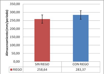 Para el factor Riego, gráfico 1, se observa que la mayor respuesta se obtuvo en r1 (con riego) con un almacenamiento promedio de 283.37 mm, en tanto que, la menor respuesta se obtuvo en r0 (sin riego) con un almacenamiento promedio de 258.64 mm. La capacidad de almacenamiento del suelo es relativa no sólo al tiempo, sino también a la composición textural y a la secuencia de capas del perfil; así como, a la distribución inicial del contenido de aguas Velásquez (2010).