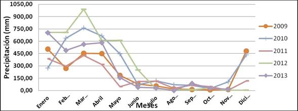 La precipitación favorable se cifra entre 1800 y 2200 mm anuales; aunque, se debe tener presente que no basta estudiar la cantidad anual de precipitación, sino su distribución mensual e incluso por décadas, y es aquí donde nuestro sitio experimental tiene ingerencia sobre la producción ya que tenemos aproximadamente 6 a 8 meses de precipitaciones mensuales de menos de 150 mm. (Ver gráfico 6)