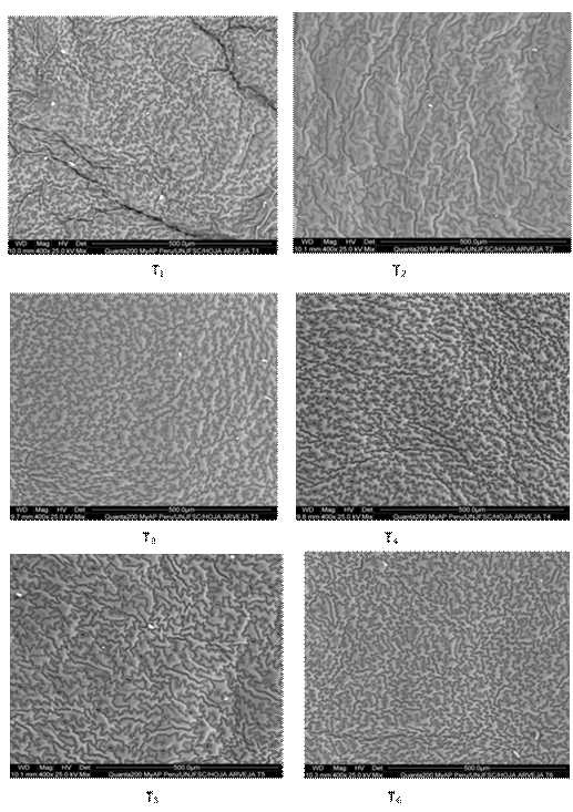 Con el uso del microscopio electrónico de Barrido para el grado de aumento de 800 X, se obtuvo la micrografía por tratamiento, lo cual permitió determinar que la mayor densidad de estomas se obtuvo el T6 con 241.93 estomas/ mm2, Por lo que se analiza que a medida que se incrementa la concentración de nitrógeno y se aumenta en distanciamiento incrementó la densidad de estomas; sin embargo el T5 con 98.79 estomas/mm2 sobresalió en rendimiento, por lo que a medida que se incrementó el nitrógeno y disminuyó en distanciamiento obtuvo mayor rendimiento (ver Tabla 10).