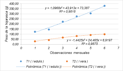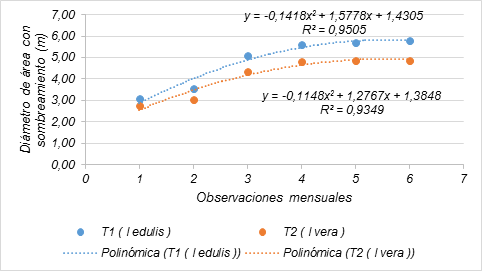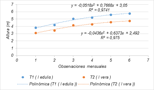 La especie Inga edulis tiene una línea de tendencia de crecimiento polinómica con un R² = 0.9741, a su vez la ecuación que expresa su crecimiento es y = -0.0518x2 + 0.7668x + 3.05, mientras que Inga vera también expresa una tendencia de crecimiento polinómica con un R² = 0.975 y la ecuación que expresa su crecimiento es y = -0.0436x2 + 0.6373x + 2.492. Las tendencias de crecimiento son similares sin embargo la mayor altura la obtuvo el tratamiento 1 Inga edulis. Tanto I. edulis como I. vera son especies cuyo principal uso es la producción de fruta. Este tipo de árboles se caracteriza por poseer un crecimiento polinomial de primer orden que se ajusta a cortos períodos de tiempo (15). Se corrobora ello en el lapso de dos años, correspondientes al ensayo, especialmente para I. edulis, la cual supera el crecimiento inicial de I. vera, manifestando una fase exponencial en el segundo año, donde se muestra su mayor tasa de crecimiento (Figura 1).