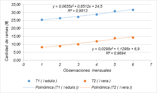 Se demostró que, hasta los dos años de establecimiento, la línea de crecimiento de las especies I. edulis e I. vera es polinómica en altura, diámetro, ramaje y sombreamiento (R² = 0.9). I. edulis superó a I. vera en todos indicadores de desarrollo fenológico analizados. Además es mayor su aporte edáfico de NH4, alcanzando 39.76 kg N/ha/año contra los 32.14 kg N/ha/año a los que llega I. vera.