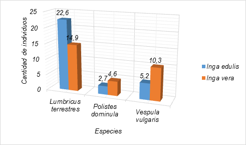 A los 24 meses de establecimiento de los árboles, se realizó la identificación de organismos benéficos en el área de influencia Inga edulis e I. vera. A nivel de suelo, a una profundidad de 0,30 m en un área de 1 m2 se contabilizaron los individuos de Lumbricus terrestres (orden Crassiclitellata, familia Lumbricidae), mientras que en el dosel de ramas se realizó observación, sin captura, de la cantidad de Polistes dominula y Vespula vulgaris (orden Hymenoptera, familia Vespidae) habitando los árboles muestreados (Figura 6). La presencia de fauna benéfica se deriva del hábitat conformado por los cultivos de sombra, que sirve como refugio de la fauna silvestre (7).