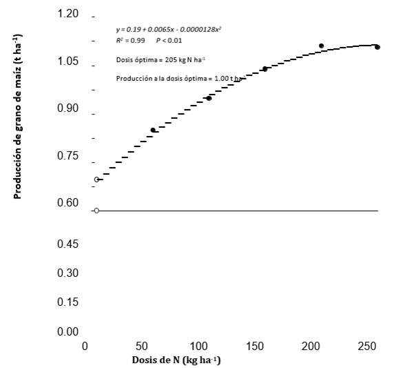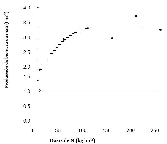 En estos modelos, y representa la respuesta de la producción de grano o biomasa (t ha-1) a la FN, x la dosis de fertilización (kg N ha-1), y a (intercepto), b (coeficiente lineal), c (coeficiente cuadrático), y xo (dosis de fertilizante de N en el punto de unión) son constantes de los modelos. La DON y la producción con la DON fueron calculadas utilizando la metodología propuesta por Cerrato y Blackmer (1990). Para la producción de grano se resuelve para x utilizando una relación de 0.0012 $ kg-1 N a $ t-1 entre el precio del fertilizante y el precio del grano, respectivamente. Para ello se utilizó un precio de $ 35 por cada saco de 50 kg de urea, $ 15.90 por cada quintal de grano de maíz producido, y una producción promedio de 3.50 t ha-1 (77 quintales) (MAGAP, 2014). Para la producción de biomasa la relación fue de 0.0038 $ kg-1 N a $ t-1, con un precio de $ 80 por cada t de biomasa producida (materia seca), y una producción promedio de 5.00 t ha-1.