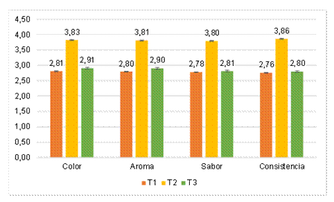 Se realizo la evaluación sensorial a los 3 tratamientos (T1, T2, y T3) con 15 panelistas semi entrenados, donde resulto con mayor puntaje el tratamiento 2 (T2), para el color obtuvo 3,83 de aceptación, para el aroma obtuvo 3,81 de aceptación, para el sabor obtuvo 3,80 de aceptación y para la consistencia obtuvo 3,86 de aceptación.