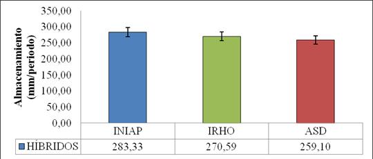 Para el factor Híbridos, Gráfico 2 se observó que el híbrido INIAP presentó la mayor respuesta con un almacenamiento promedio de 283,33 mm; en tanto que, el híbrido ASD presentó la menor respuesta con almacenamiento promedio de 259,10 mm.