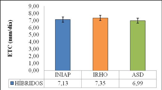 Para el Factor Híbridos, gráfico 4, se observó que, el híbrido ASD (h3) presenta la mayor respuesta con una evapotranspiración del cultivo promedio de 2.68 mm día-1, el híbrido h1 (INIAP) con una evapotranspiración promedio de 7.13 mm día-1; mientras que, el híbrido CIRAD (h2) presentó la menor respuesta con una evapotranspiración promedio de 2.23 mm día-1.