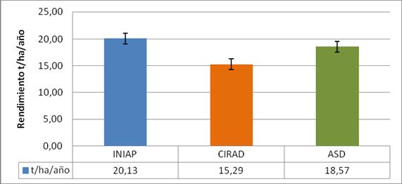 Para el Factor Híbridos, cuadro 3, gráfico 5, se observa que, al híbrido INIAP (h1) presenta la mayor respuesta con una producción total promedio de 20.13 t/ha/año; mientras que, el híbrido CIRAD (h2) presenta la menor respuesta con una producción total promedio de 15.29 t/ha/año y el ASD con 18.57 t/ha/año.