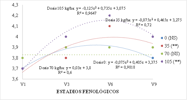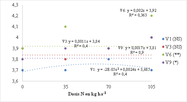 nitrógeno (0, 35, 70 y 105 kg ha-1) y factor B momento de aplicación en estados fenológicos (V1, V3, V6 y V9), con tres repeticiones. Los datos obtenidos fueron evaluados