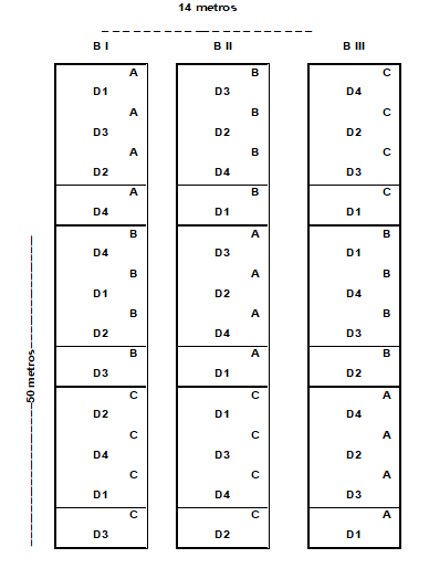 utilizado um desenho de parcelas subdivididas 3x4 com 3 repetições, totalizando