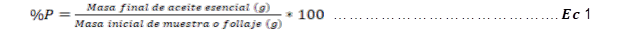 esencial se obtuvo por arrastre a vapor de agua, posteriormente se determinó su