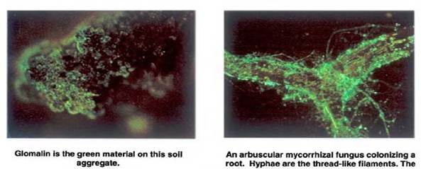 En relación al suelo, los hongos micorrizogenos constituyen un componente vital de su microbiología, pues se reconoce que producen la glomalina, una glicoproteína protectora de la hifa, tiene efecto de aglutinante natural que estimula la agregación de partículas en el suelo. La glomalina que ha demostrado gran persistencia en el suelo y capacidad de ocupar una fracción significativa de la materia orgánica y carbono total del suelo. (Douds, s/f.).