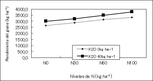 La Figura 2 muestra la dinámica del rendimiento del grano de acuerdo la aplicación nitrogenada química entre los tratamientos de 0 y 40kgK2O ha-1. De los resultados de análisis de varianza, se observó diferencia significativa al 1% no sólo en los niveles de N sino también en los niveles de K. Se aumentó hasta 3779kg ha-1 como el rendimiento por la aplicación de 100kgN ha-1 y de 40kgK2O ha-1. Se considera que la aplicación óptima-económica de N y K fue muy importante para asegurar el rendimiento adecuado para el cultivo de arroz bajo riego en la región de Llanos de Coclé en Panamá.