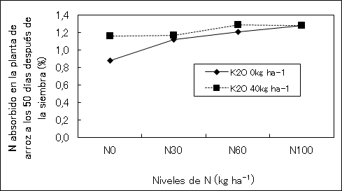 La Figura 3 muestra la dinámica del N absorbido en la planta de arroz a los 50 días después de la siembra de acuerdo con la aplicación nitrogenada química entre los tratamientos de 0 y 40kgK2O ha-1. De los resultados de análisis de varianza, se observó que hubo diferencia significativa al 5% en los niveles del N, solamente. No se observó la diferencia del N absorbido entre los tratamientos de 0 y 40kgK2O ha-1 en los tratamientos de 30 a 100kgN ha-1.