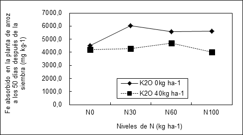 Figura 5. Dinámica del Fe absorbido en la planta de arroz a los 50 días después de la siembra de acuerdo con la aplicación nitrogenada química entre los tratamientos de 0 y de 40kgK2O ha-1.