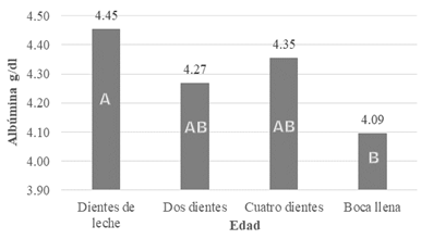 Las llamas dientes de leche, por la intensa actividad metabólica debido al crecimiento corporal, tienen niveles de albumina sanguínea superiores para el transporte de diferentes compuestos necesarios para el desarrollo del animal. En llamas adultas las funciones vitales tienden a disminuir aspecto que influye para que las concentraciones sanguíneas de albumina disminuyan. Para Radostits et al. (2002) las concentraciones de albúmina disminuyen a medida que aumenta la edad del animal.