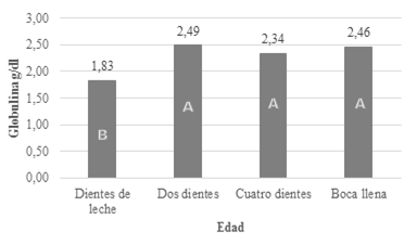 Las globulinas (Gráfico 3) son los constituyentes fundamentales de los anticuerpos, pueden actuar como proteínas transportadoras que vinculan sustancias específicas. Los parámetros de globulinas son similares en llamas DD, CD, BLl y superiores a DL (=0.05).