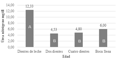 Los animales jóvenes dientes leche tienen capacidad selectiva de pastos de buena calidad nutritiva que favorecen el mayor desarrollo de microorganismos en los compartimientos C1 y C2 por lo que los niveles sanguíneos de urea son superiores. En los animales de mayor edad los niveles inferiores indican que la ingesta proteica es mínima debido a la baja calidad de los pastos y mayor requerimiento de proteínas por su estado fisiológico reproductivo. (Gráfico 4).