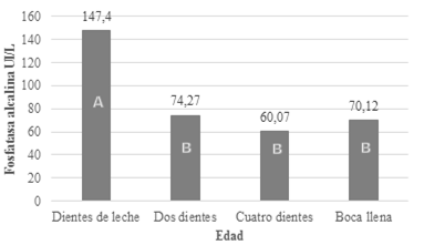 Las llamas dientes de leche por el aumento de la fracción ósea que traduce la actividad osteoblástica del hueso (crecimiento) presentan elevación fisiológica de la actividad enzimática de fosfatasa alcalina; situación que disminuye en los animales de mayor edad. (Gráfico 5).