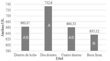 La amilasa es una enzima que se origina en el páncreas y glándulas salivales. La actividad enzimática de amilasa son superiores en llamas DD e inferiores en BLl, y en llamas DL, CD son similares a las anteriores (=0.05). Las diferencias corresponden a variaciones fisiológicas de los animales. (Gráfico 6).