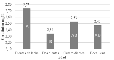 La creatinina es el producto resultante del catabolismo muscular, las concentraciones sanguíneas se relacionan con el volumen de filtrado glomerular. Los niveles de creatinina sanguíneos son superiores en llamas DL e inferiores en DD, en llamas CD y BLl son similares a las anteriores (=0.05).