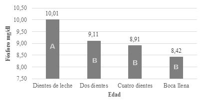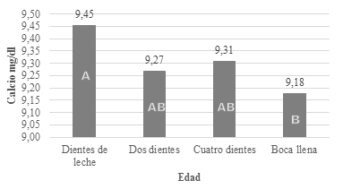 En llamas dientes de leche, la intensa actividad metabólica en el crecimiento óseo determina la mayor movilización sanguínea de calcio por esta razón los niveles plasmáticos son superiores. La concentración de calcio disminuye a medida que aumenta la edad debido a la menor movilización; además solo es utilizado para el mantenimiento, el soporte y locomoción del organismo en los animales de mayor edad. (Gráfico 9).