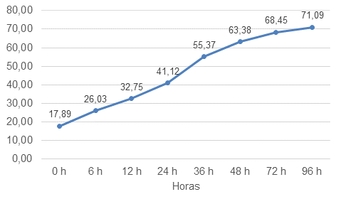 La degradación de fibra detergente ácida (tabla 10), a las 96 y 72 horas son similares y superiores con 34,95% y 34,17% con respecto a las 48 horas con 32,48% que a su vez es similar a las 72 horas de incubación, seguida de 36 horas con 30,16%; 24 horas con 21,77% y 12 horas con 16,79%, con menor porcentaje de degradabilidad se da a las 6 horas con 12,57%.