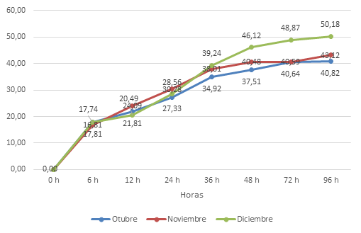 El gráfico 7, muestra que la mayor degradabilidad de la fibra detergente neutra ocurre en el mes diciembre durante 48, 72 y 96 horas con 46,12%; 48,87% y 50.18% respectivamente; en los meses de octubre y noviembre la degradación de FDN son similares e inferiores con 37,51%; 40,64%; 40,82% y 40,48%; 40,59%; 43,18% respectivamente.